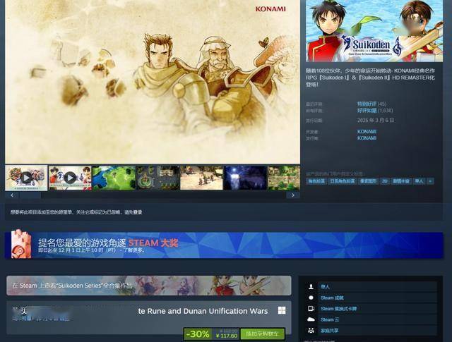 近日,科乐美(KONAMI)旗下经典JRPG《幻想水浒传1&2HD复刻版》在Steam平台迎来新史低促销。原价168元的游戏现以117.6元的7折特惠价格出售,此次优惠活动将持续至12月9日。