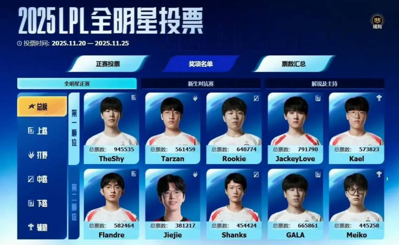 LPL今年的全明星与往年的评选规则差不多,重点就是选出两支由人气最高选手组成的战队,其中全位置人气最高的人会当选为年度最受欢迎选手,这个是年底颁奖典礼其中的一个含金量较高的奖项。