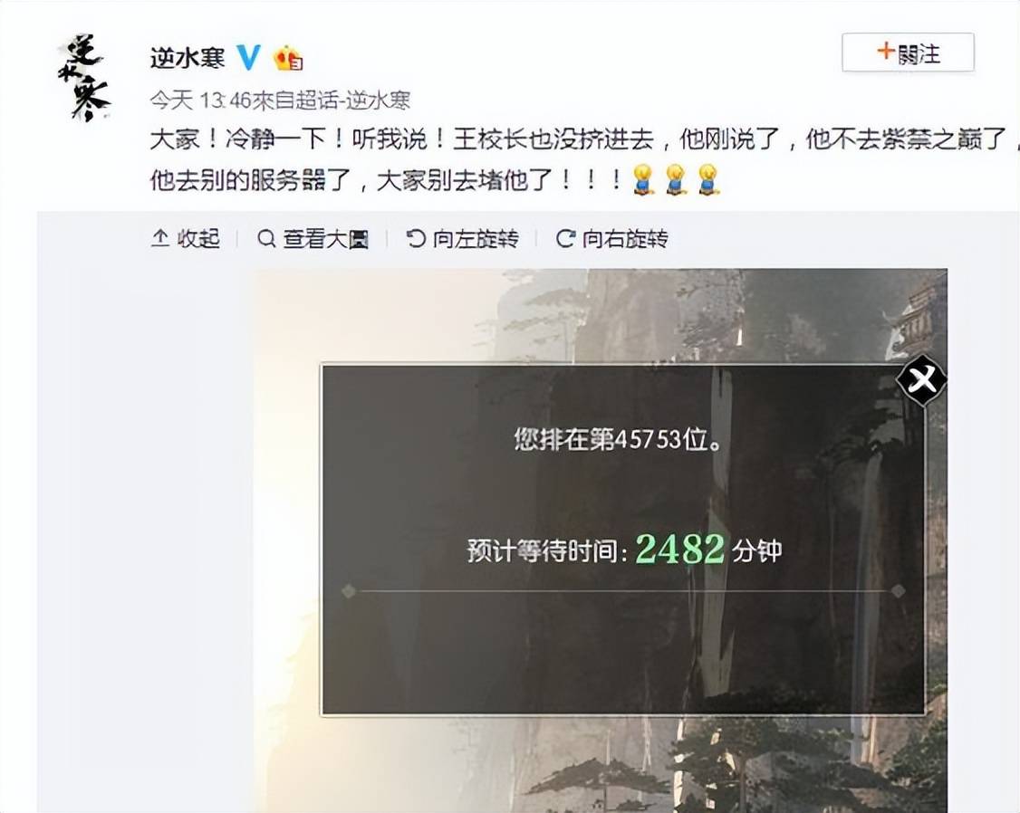 开服初期往往是一款游戏人气比较高的阶段之一,抢前排服务器的、抢注热门ID的、想抓紧时间体验游戏的等等各种各样的玩家涌入。就比如此前《逆水寒》公测的时候,其排名第一的服务器“紫禁之巅”甚至出现了万人排队的场面,等待时间长达几十个小时,甚至就连王思聪都发微博让玩家们不要再往“紫禁之巅”挤了。《逆水寒》“百万排队”也成了游戏圈被玩家们津津乐道的梗,虽然数据可能不准,但人气可见一斑。