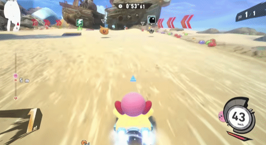 ——听起来很简单,但这种情况只存在于理论之中。《卡比的驭天飞行者》和其他任何赛车游戏都不同的地方在于,玩家攻击对手或NPC时会获得加速度。也就是说,在实际比赛中,光靠驾驶技术是远远不够的,还要边开车边揍人才能最先冲到终点。