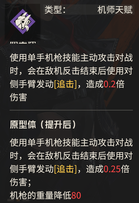然后洛莎的天赋其实很简单,就是一个0.2-0.25倍的追击伤害,大家注意这个追击伤害使用另一只手的机枪进行输出的,假设你另一只手已经被击毁了,则不会触发这个效果。