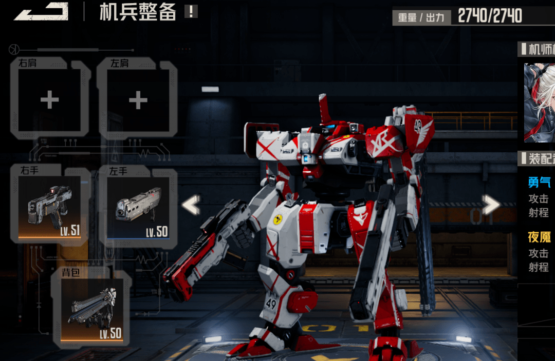 然后下面这个潜能3的机枪重量降低80,则是为了让潜能3后的洛莎,在驾驶XR时可以同时左右手装备最优金色机枪“夜魇”+电磁炮“炬塔”,而如果没有潜能3的话,大家在驾驶XR时便只能选择次级金色机枪“马克”+电磁炮“炬塔”,又或者像下图中一般一只手带夜魇,一只手带蓝色的机枪......这也是XR为什么会和洛莎绑定的最大原因所在。