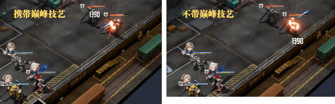 经过实测,在不暴击的前提下,分别携带和不带【巅峰技艺】增伤,洛莎用电磁炮打敌人手臂的伤害都是1390点,所以洛莎的电磁炮伤害是无法触发【巅峰技艺】和【强弱悬殊】两个技能的增伤效果的,所以虽然电磁炮输出也会有动画显示,但这个群体技能则是属于例外,大家注意即可。