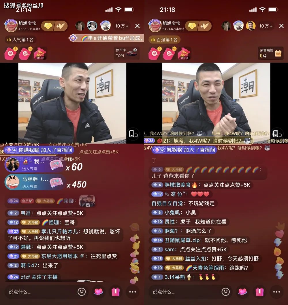 旭旭宝宝当晚开播,人都还没出现直播间人气就已经达到了10万+,并且进入人气榜第一名。在伴随“男人哭吧不死罪”的音乐中旭旭宝宝出现在直播了,他略带羞涩傻笑着感谢大家,表示自己都说不出话了。