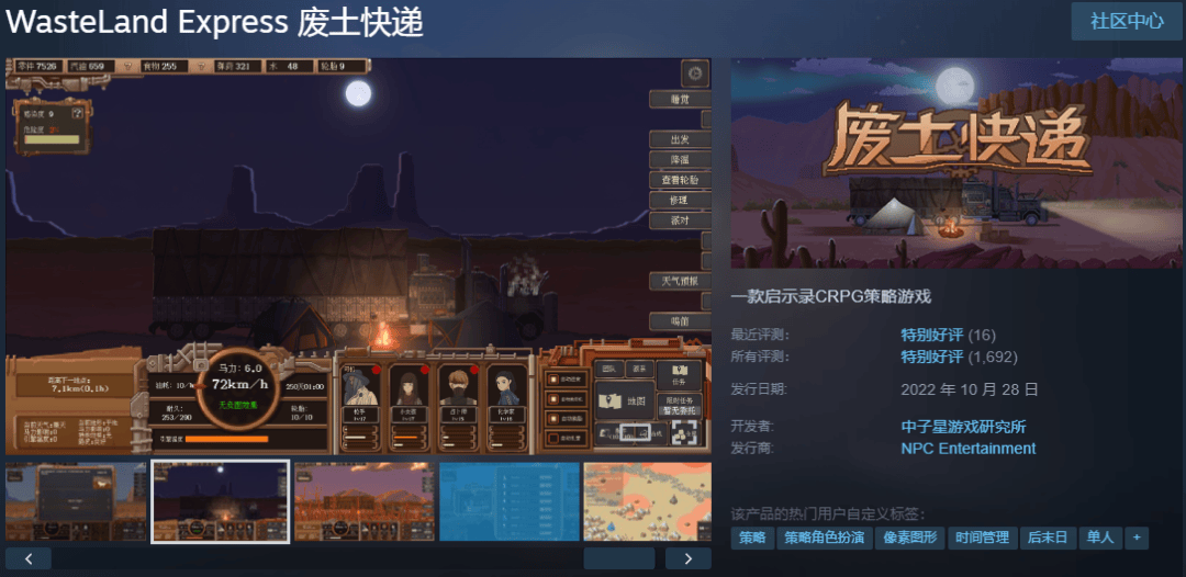 末世CRPG《废土快递》由中子星团队创始成员之一“团长”历时三年打造,游戏讲述了一名小商贩变卖所有家产,购置一辆货车开启的探险之旅。《废土快递》曾参加 2019 腾讯 NEXT IDEA 高校游戏创意制作大赛,并于2022年10月28日上线Steam,至今已获得94%好评,据VG insights预估,其销量已达5.3万。