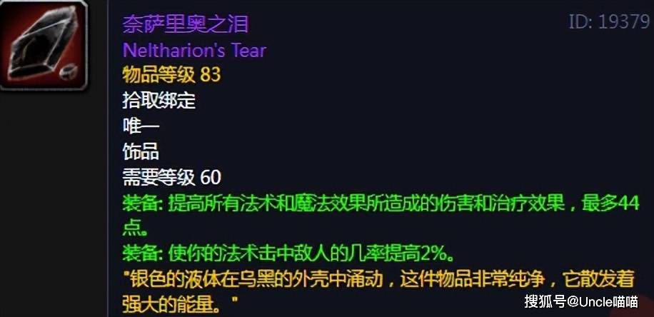 喵叔觉得,魔兽世界最经典且可玩性高的两个版本非地球时代和TBC莫属了,而对于地球时代其实相对来说还没有成就完全体,很多职业以及装备的设计都没有达到完美状态,不过饶是如此,地球时代依旧有着一批法系输出饰品堪称无解,对后期版本影响都非常深远!回归正题,第一款给到的是黑翼之巢奈法利安的奈泪,2%的法术命中几率和44点常驻稳定法伤,也是直接让其洞穿版本剑指TBC无压力。核心缘由还是这命中真的太香了,地球时代无论物理职业还是说法系输出,对于基础命中的需求都时刻在线,那么问题就来了,你们有经历过法师团长携奈泪和金币无情下线的吗?