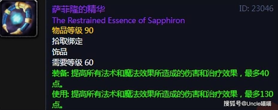 如果你畅游过最原始版本的纳克萨玛斯,那么喵叔将毫不犹豫的尊称你一声“真远古大佬”,他的无解之处主要有两点,其一他是版本最强的法系输出爆发饰品,常驻的法伤虽然比奈泪少了4点,但是恐怖如斯直戳天花板的可控法伤爆发,已经无限接近TBC水准,不夸张的说,拥有它你基本上可以无视燃烧的远征版本初期牌子饰品了。其二是他的获取难度堪称无解,虽然说怀旧服时代以金币论英雄,但是在那没有金团只有实力的年代,别说见到萨菲隆了,很多人半只脚都没能踏入纳克萨玛斯的大门。所以第二个无解席位萨菲隆的精华坐上去是毫无压力的!就问问屏幕前有没有手握鸡腿杖,腰间挂着奈泪和萨菲隆精华的大兄弟?