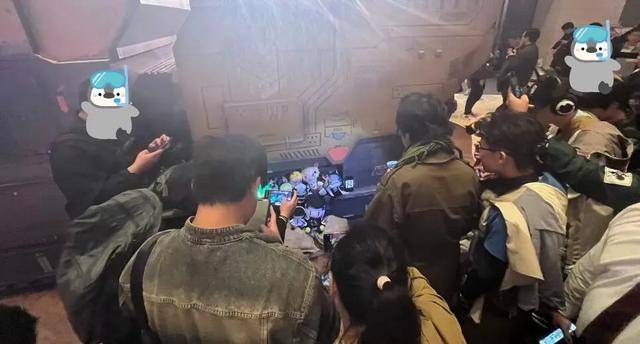 7分钟后,这里俨然已发展出“庞大家族”,羽中(散爆CEO、少前系列制作人)照片被摆在正中间“镇场”,一批又一批玩家挤进来拍照。