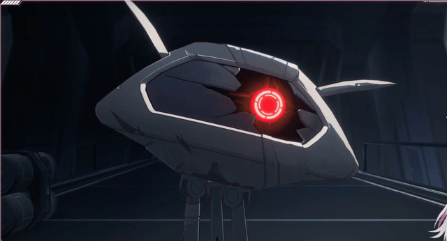 随着主角往前探索,一个浮空的机器人出现。对比那些令人恐怖的生物,这个冒着红光,而且个头比较小的机器人好像并没有什么威胁。但是这个时候可以注意听背景音,用八音盒演奏的童谣不知什么时候开始响起,与黑黢黢的环境形成鲜明的对比,这是很多恐怖片都会运用到的手法,暗示平静下的诡谲。
