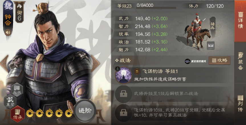 钟会,可以说是中慢速队伍的克星,虽然在群骑内战中,钟会由于对群骑其他人战法效果不太明显而不太好用,但在对战北伐、火烧等中慢速队伍时相当好用了。