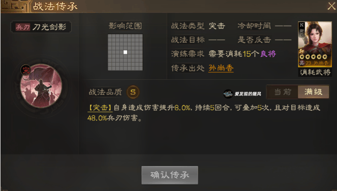刀光剑影,一个基本适合所有兵刃普攻型武将的战法,最多能叠40%造成伤害,效果还是不错的,但孙尚香本体比较难抽,一般也会先用本体。