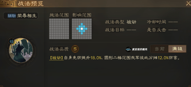 荣辱共生,事件战法用曹丕换的,一个很适合慢速队携带的战法,比如北伐队,各种召唤队,这些队伍通常都有不少光环减伤战法,只要不减员就能越苟越强,而这个荣辱共生战法减少了一些单体暴毙的可能性,也算是一个不错的战法了。