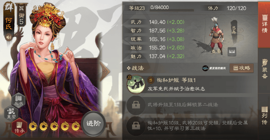 但这个武将感觉还是有开发空间,机制放在那里,未来如果有一些每多存活一回合就很高收益的武将或者战法,何氏还是有可能翻身的。