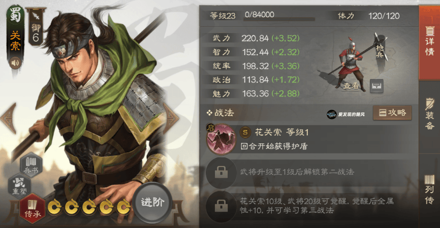 腹有鳞甲,一个很适合DOT队的启动输出,特别适合用来打BOSS,另外这个战法和郭嘉也是绝配,瞬间伤害虽然不高,但是持续输出还是不低。