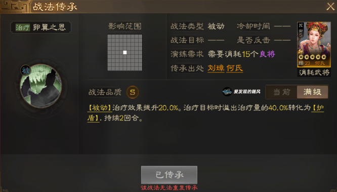 卵翼之恩,也是开荒就能用得上的战法,能将治疗效果提升20%,然后溢出的40%治疗量转为护盾值,配合一些治疗武将本身就有的治疗,比如华佗,大乔等,这个效果相当好用。