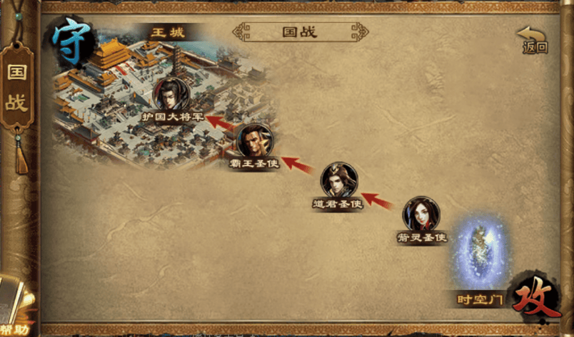 活动开启后,三大护国圣使以及大将军出现在大陆要道。需要先后击败箭灵圣使、道君圣使、霸王圣使和护国大将军。护国大将军被击败,则攻方获得胜利,反之,活动倒计时结束时护国大将军存活则守方胜利。国战攻方增加攻城车玩法,会对守方护国Boss造成额外伤害,活动场景中所有模式只能对敌对阵营玩家造成伤害;胜利方国家等级升一级,失败方降一级。
