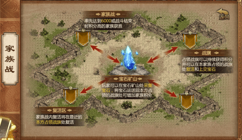 家族战就是家族之间夺取宝石矿山,将宝石搬运至己方战旗上交即可获得活动积分。宝石品质越高积分越高,品质分别为绿、蓝、紫、橙,分值在15-20之间,场上最多存在4个宝石,宝石只有在上交后才会再次刷新,时间为10秒。击杀敌方家族玩家可获得5积分,每个方位的战旗首次抢占可获得100积分,战旗占领后每10秒可为己方家族增加10积分,积分先到6000或活动结束时积分排名第一的家族获胜。最终夺冠家族族长将直接被任命为国王,如果本次家族战没有获胜方则上一届国王自动连任。