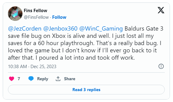IT之家此前报道,《博德之门 3》获得 TGA 2023 年度最佳游戏之后,官方宣布推出 Xbox 版。不过部分 Xbox 玩家反馈,遇到了游戏进度丢失的问题。玩家反馈丢失进度的严重程度不一,其中一名玩家反馈丢失了数十小时的游戏进度。