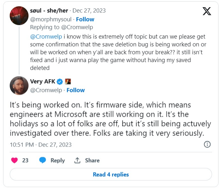 拉瑞安工作室负责人 Michael Douse 表示目前已经着手解决该问题,这是由于固件问题导致,微软正在努力修复。