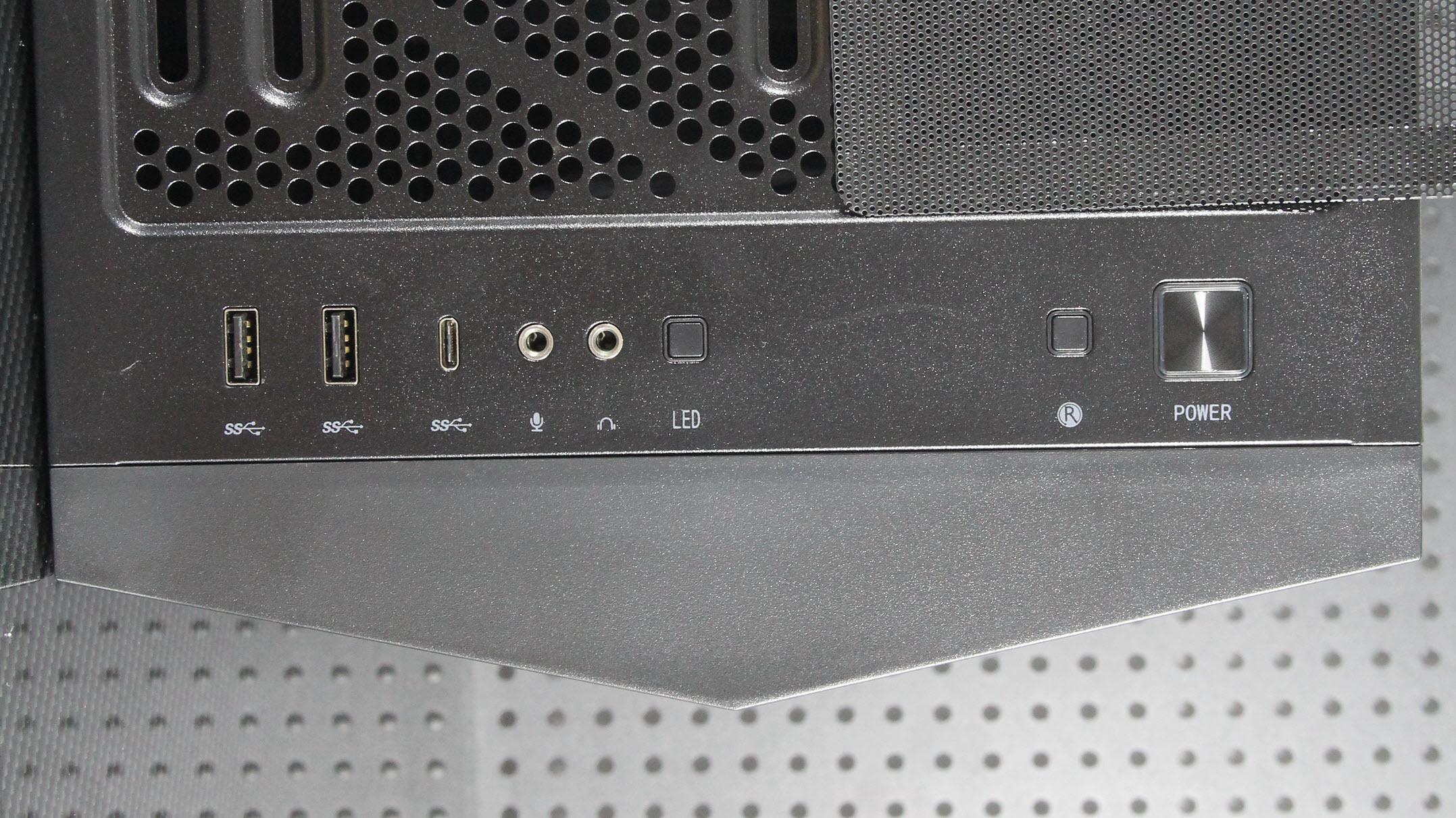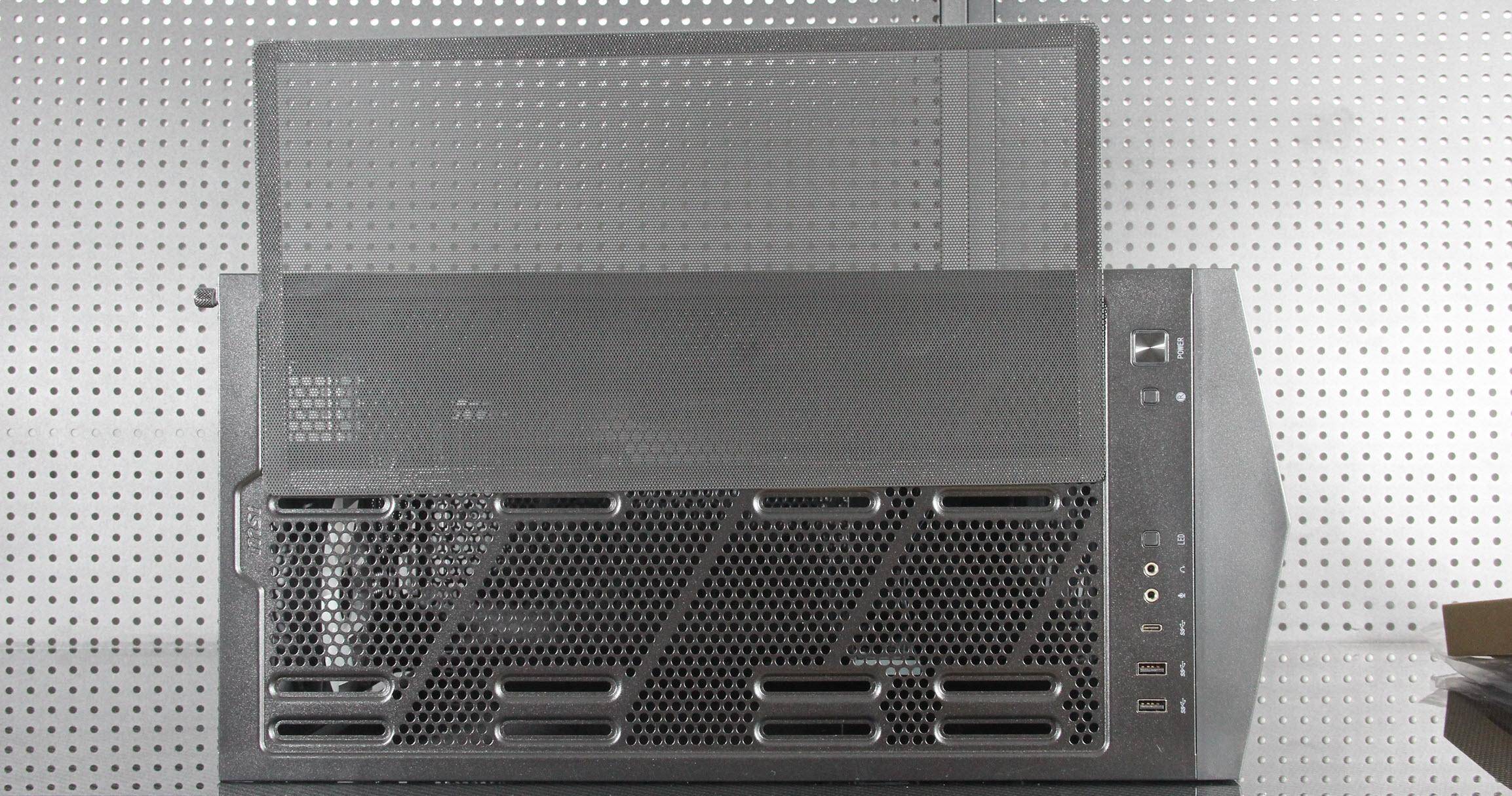 机箱的顶部IO接口丰富,包括一对USB3.1 TYPE-A、一个USB3.1 TYPE-C、一对3.5音频口、一个RGB灯效按钮、一个Reset键和一个带白色LED灯圈的大方块Power键。此外,机箱还配备了磁性防尘网的风洞顶板、支持最高360水冷排以及280尺寸的超宽水冷排。
