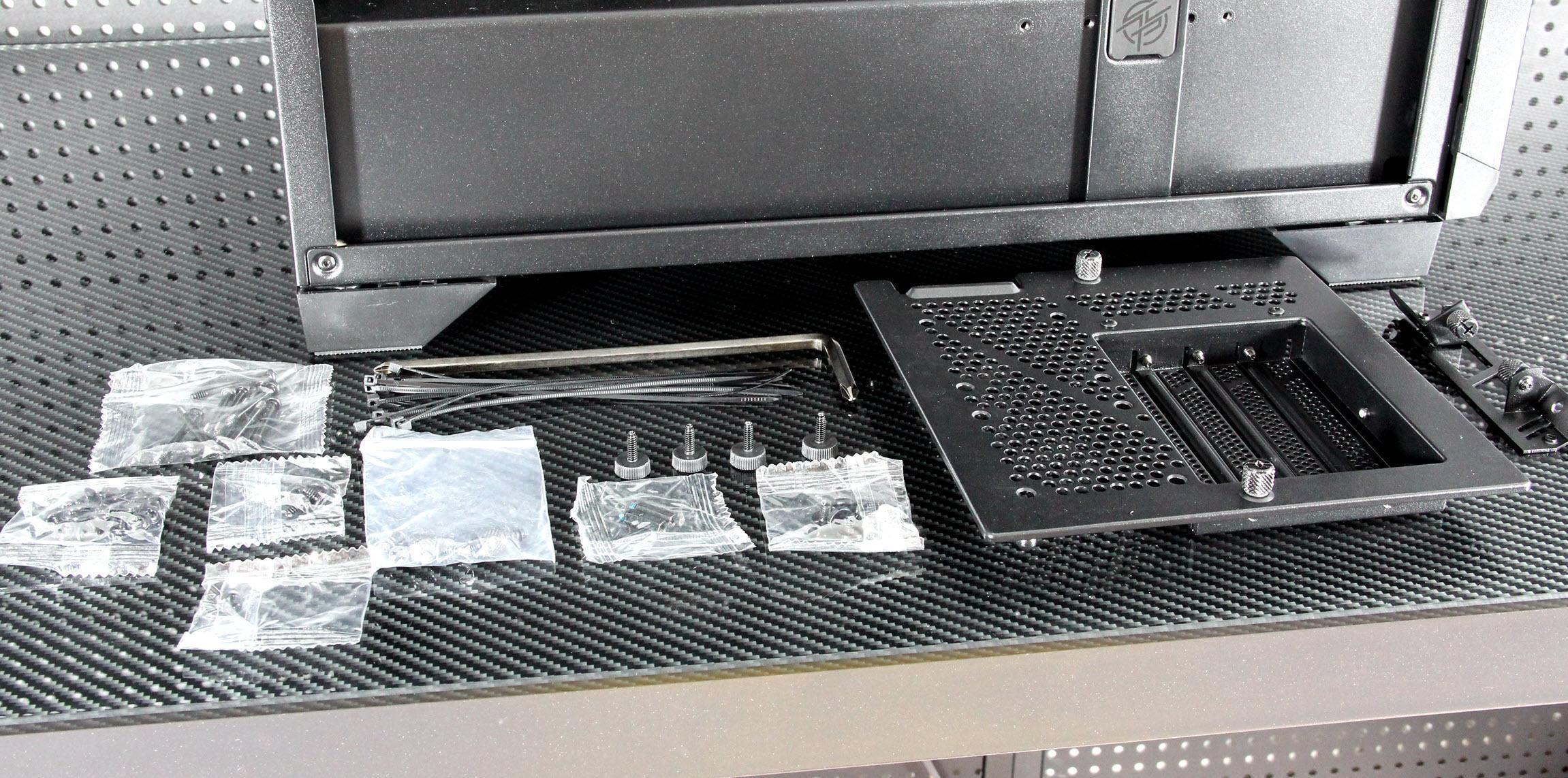 微星为氪金枪3机箱提供了相当齐备的附件,打横的PCI挡板为的是能支持显卡竖装,甚至是还配了一把“L”型双头螺丝刀,可以说只有用不上的,没有疏忽掉的。
