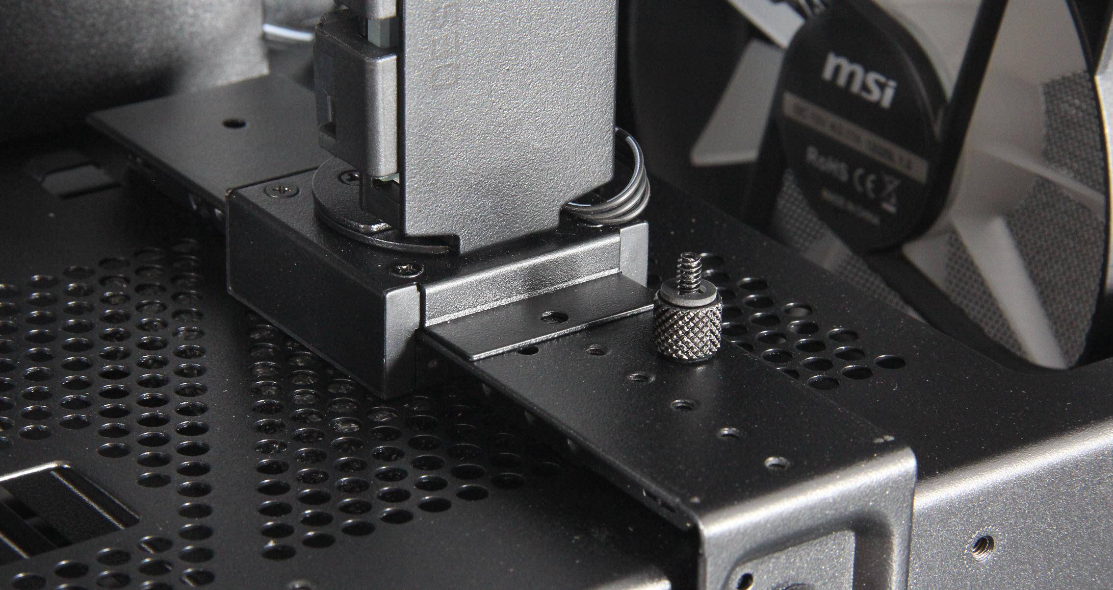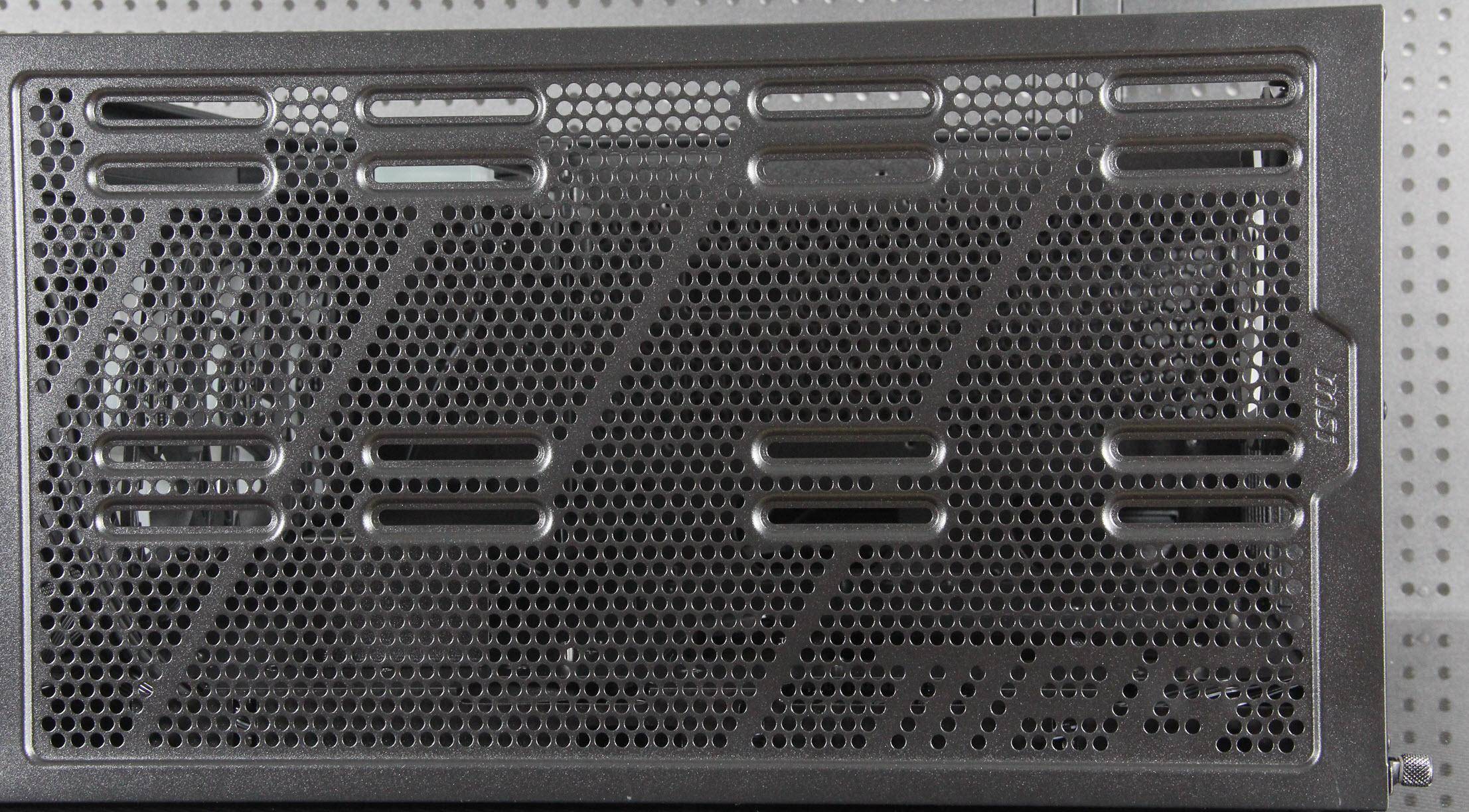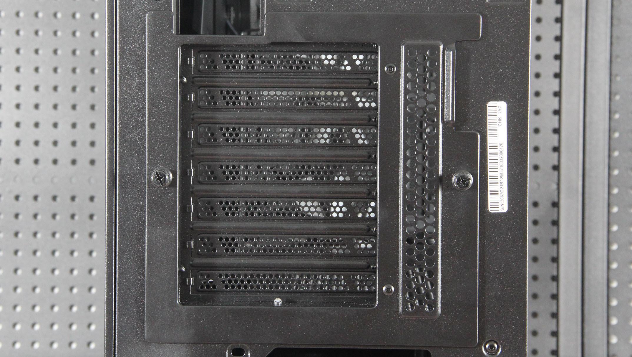 双挡板的更换就是松开拇指螺丝扣一下缺口就下来了,它采用了带紧固口的设计。氪金枪3机箱的散热性能表现出色。前面板和顶部设有通风口,支持前置和顶置风扇,而将替换的PCI挡板换上如果再装上两把60mm小风扇,一定散热更强。