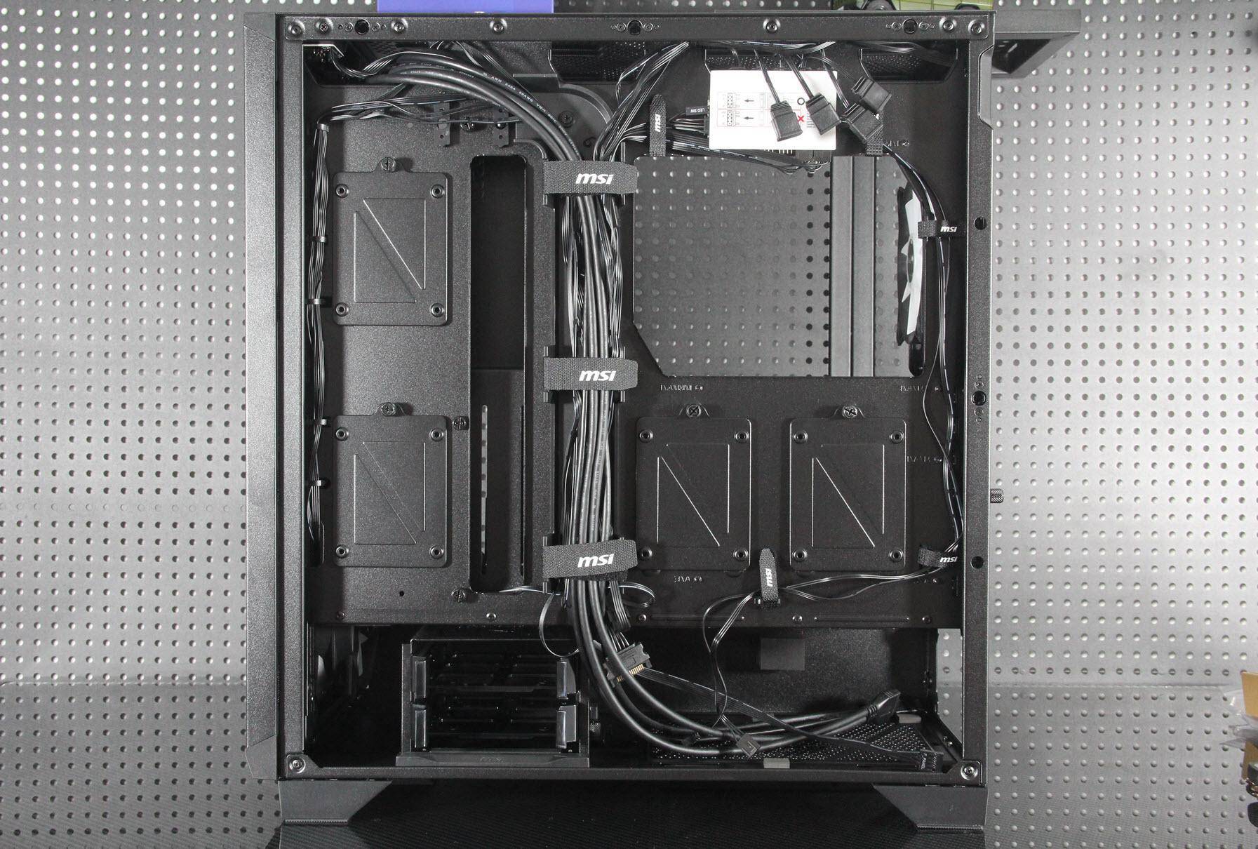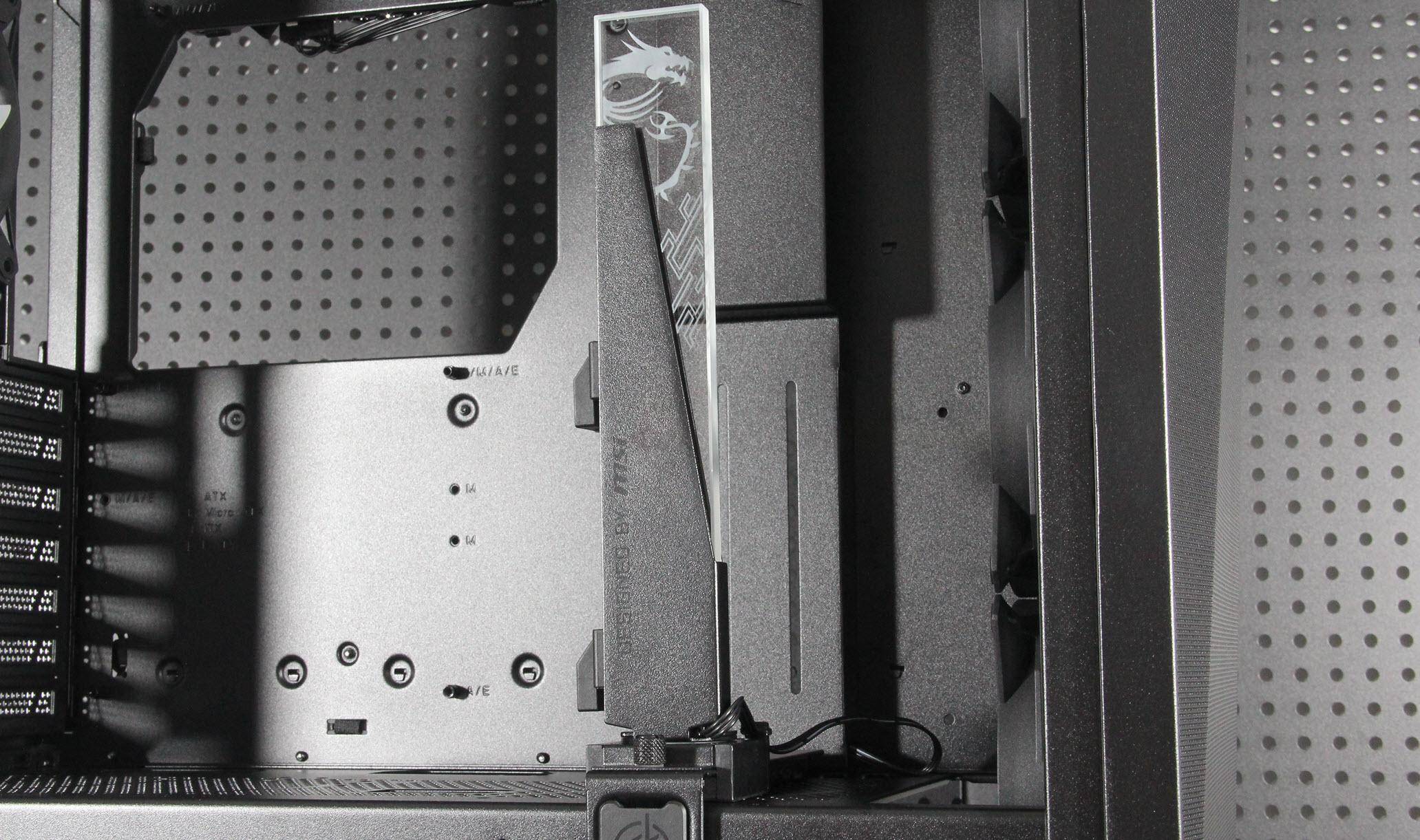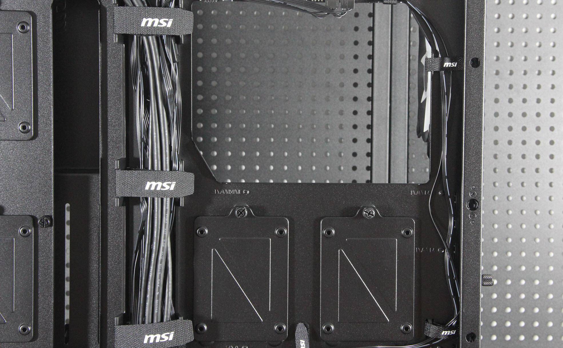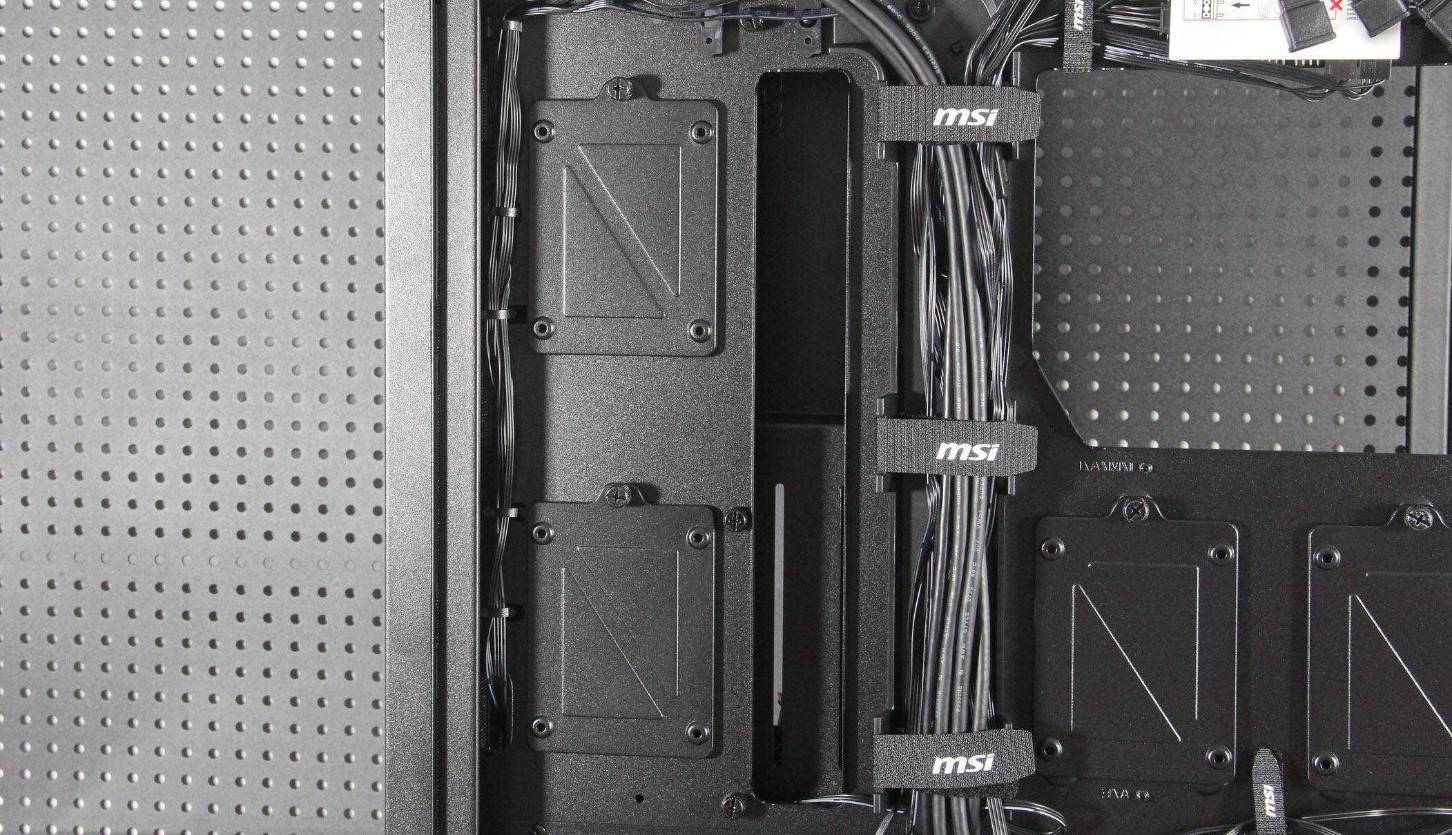 在细节设计方面,机箱的底面虽然整体上没有风道设计,只在电源位置上留了一个风洞并带有抽屉式防尘网。这些细节设计都充分体现了微星对产品的用心和对用户体验的重视。此外,四个SATA SSD硬盘架科学布局,互不干扰且免螺丝安装更加省心。