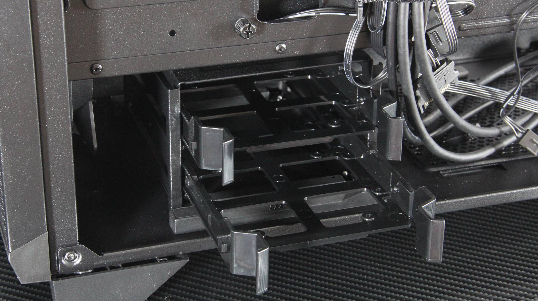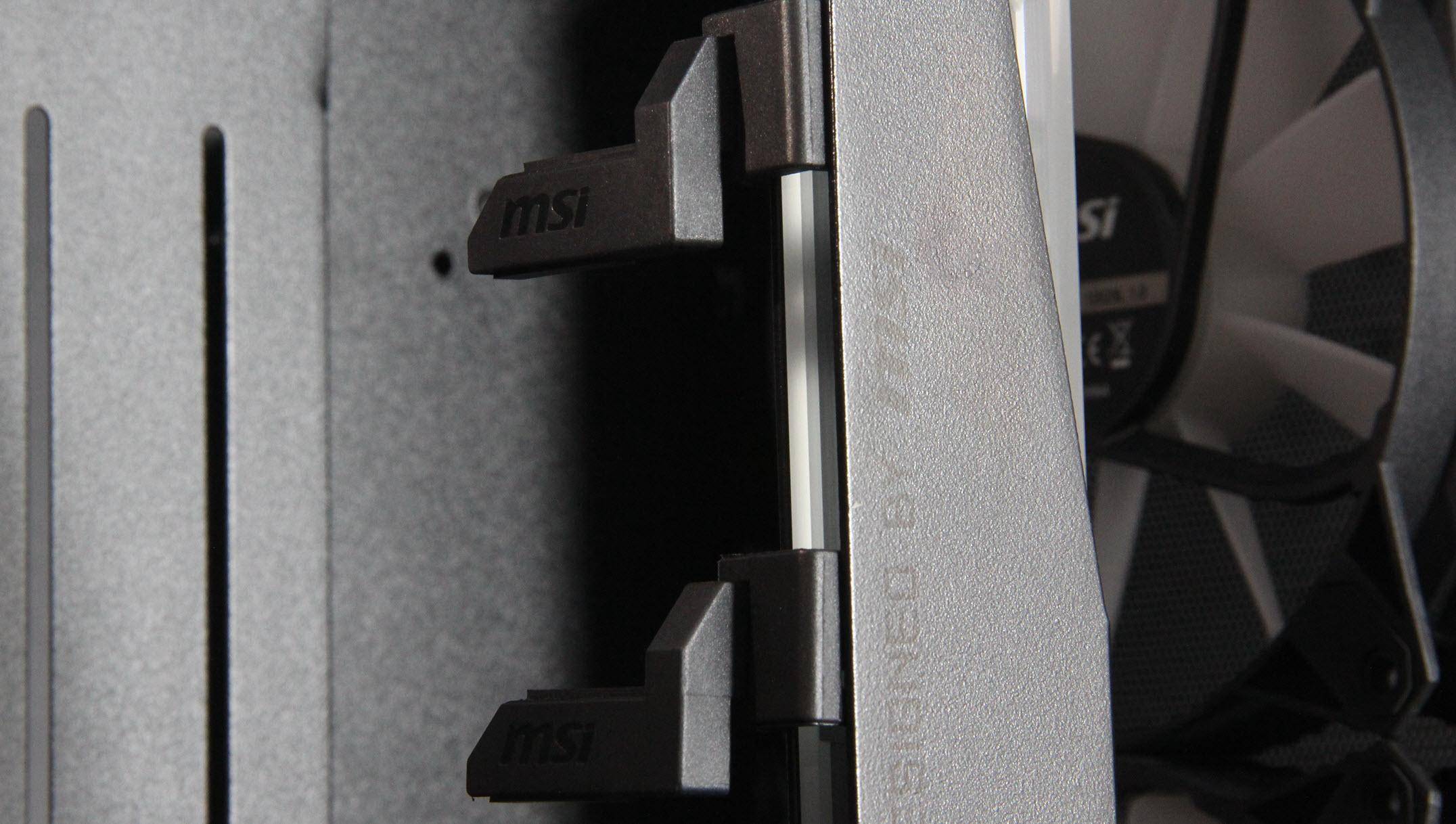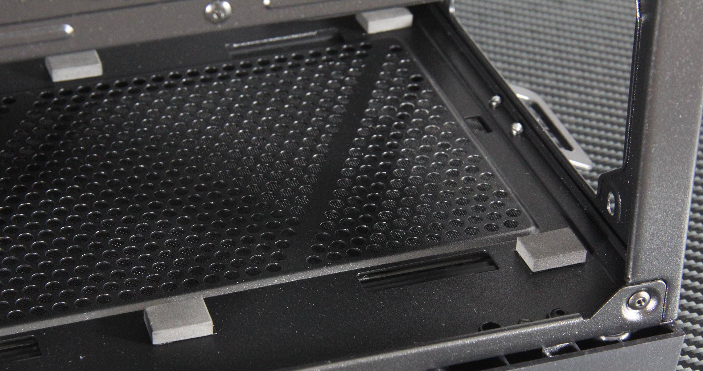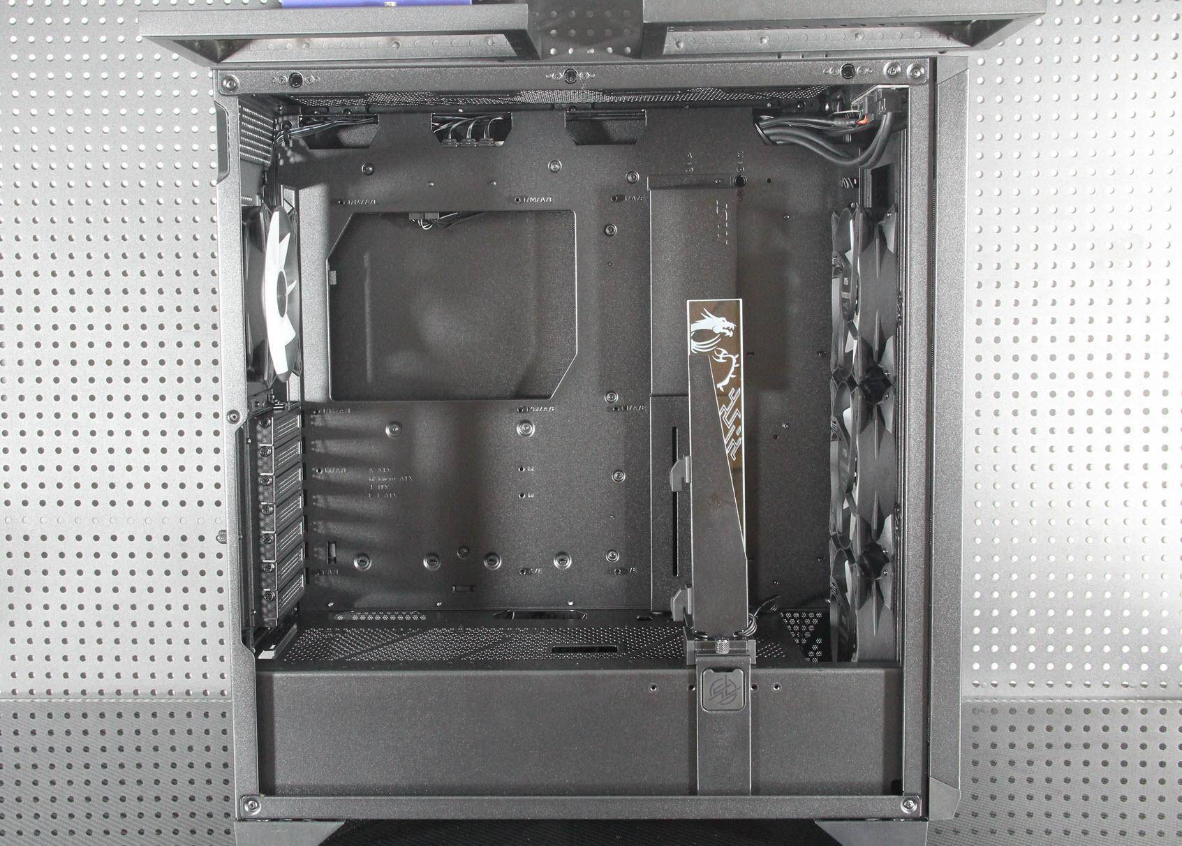 在细节设计方面,机箱的底面虽然整体上没有风道设计,只在电源位置上留了一个风洞并带有抽屉式防尘网。这些细节设计都充分体现了微星对产品的用心和对用户体验的重视。此外,四个SATA SSD硬盘架科学布局,互不干扰且免螺丝安装更加省心。