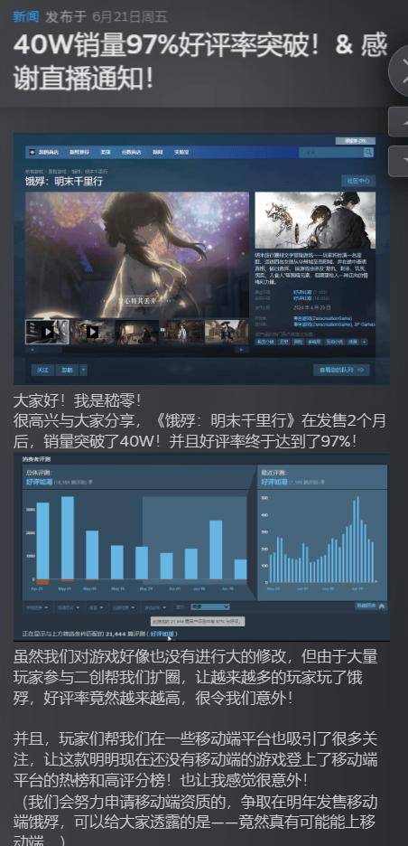 官方表示:“虽然我们对游戏好像也没有进行大的修改,但由于大量玩家参与二创帮我们扩圈,让越来越多的玩家玩了饿殍,好评率竟然越来越高,很令我们意外!”