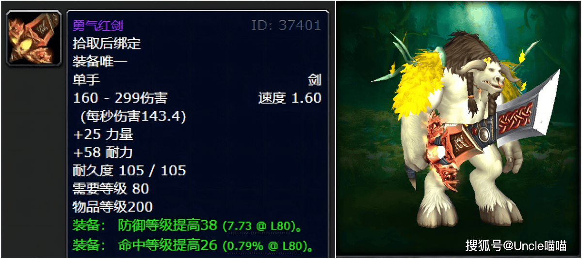 最近也是冷落了我们T玩家,那么今天你们的神兵它来了,防等、命中、力量以及耐力全系加持的勇气红剑,基本上是国王护卫者的既视感,初入80的各位战士T亦或者防骑都不允许错过的顶流。搭配上净化斯坦索姆的洛丹伦皇家徽记盾牌那真的是叫一个恐怖如斯,毕竟1.6的攻速真的是完美的仇恨诠释了,更别说这别具一格帅到天际的造型了,唯一的缺点就是掉率有点低,喵叔战士就是刷了好久硬是没见过!