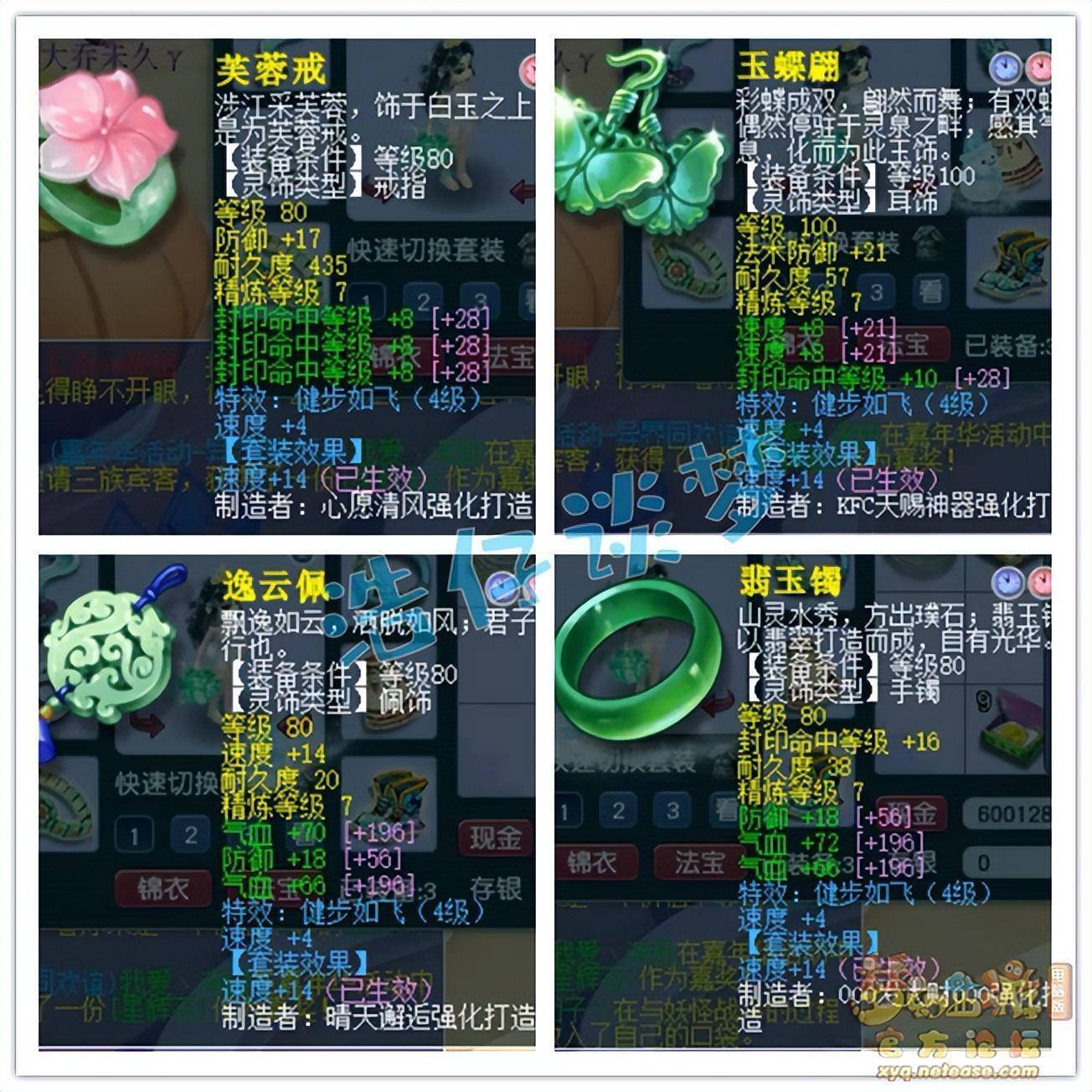 戒指下排三封印,耳饰下排双速度一封印,佩饰和手镯下排都是双气血一防御,全部打了7锻星辉石,特效4级健步如飞!
