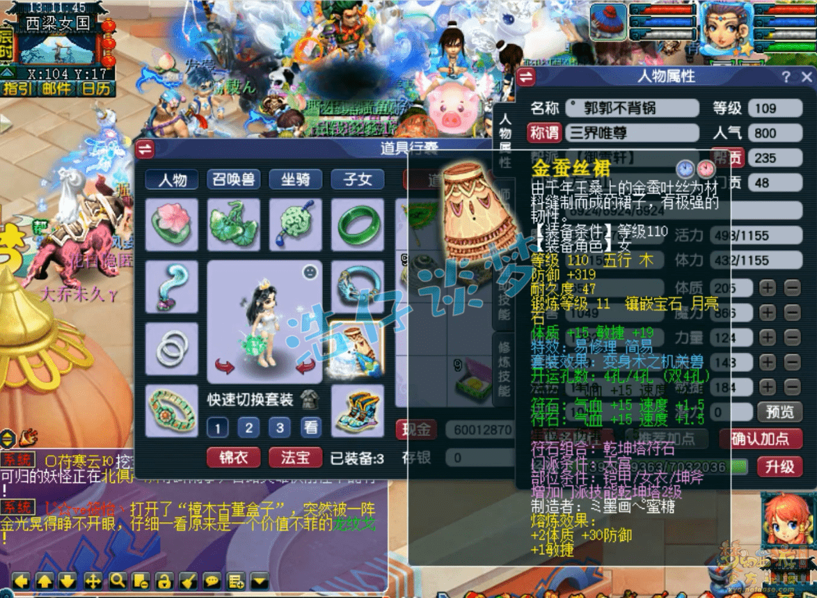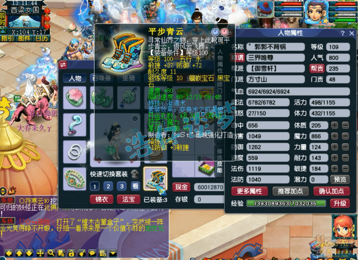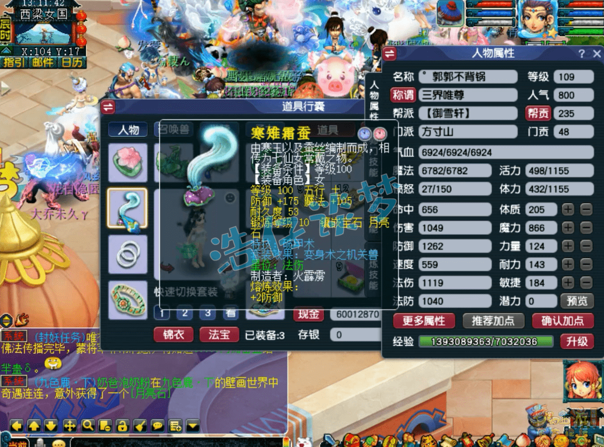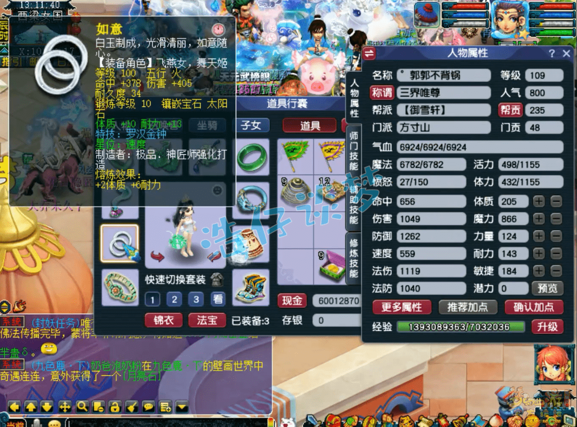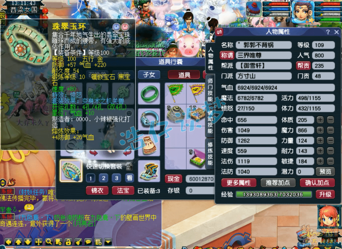 109级方寸山没打临时符的魔属性,这套属性主要用来刷任务,PK会换成耐敏属性,主要是增加抗性,速度让一速封去抢!