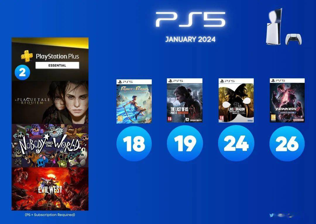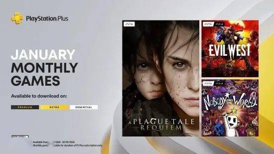 PS+方面,1月会免游戏为《瘟疫传说 安魂曲》《暗邪西部》以及《无名小卒救世界》三款。