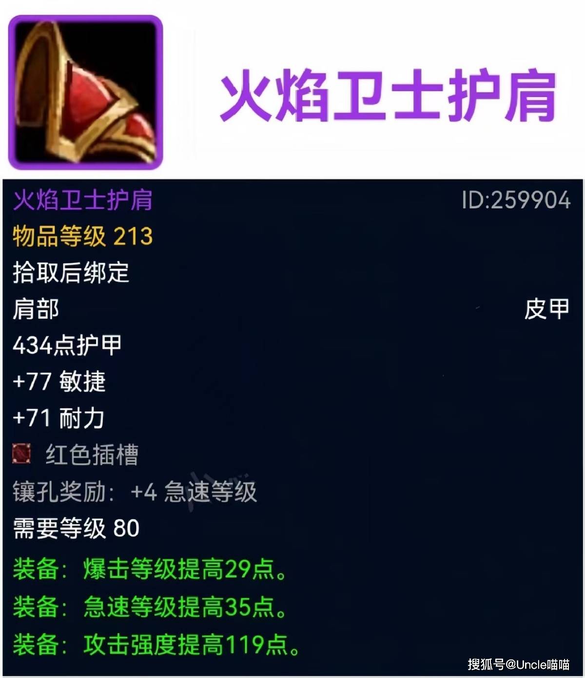 对于火焰之王宝箱回手掏的火焰卫士护肩,当年出了基本上就是黑了,因为护甲、耐力以及火抗的属性,基本也就不成型的熊T能发挥其功用,而今就不一样了,数值面板和上面的毁灭王冠一样恐怖如斯直戳天花板,感觉是个物理系都能穿,完美吊打套装的顶流存在了,估计熔火之心阶段霸榜散件必然由他一席之地。特别是猎人大兄弟,穿个皮甲肩膀应该不过分吧?