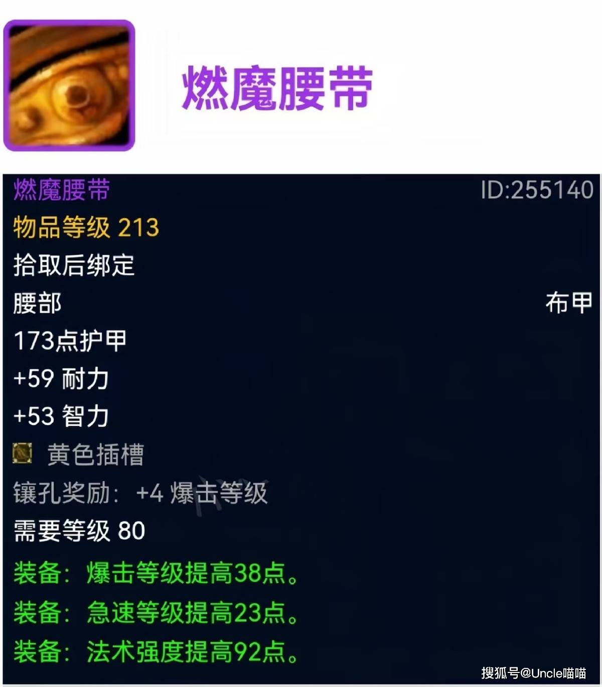 今日份最后的席位给到的是熔火之心F4共享掉落的燃魔腰带,黄色插槽与完美绿字面板,绝对能够横跨前中期无压力的极品腰带了,虽然目前还不清楚TBC的团本装等跨度会有多大,但是参考巫妖王之怒版本模式,理论上213装等的燃魔腰带依旧能够坚挺使用,带到黑暗神殿吃排骨喵叔觉得应该无压力吧!那么最后的灵魂拷问给到各位大兄弟,以上重铸后的五大极品护甲,你最期待哪一款呢?我们评论区见!