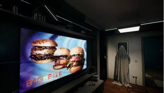 就拿第一幕场景刚结束后,玩家以游戏测试员的身份返回真实生活后,一边是昏暗的灯光下,上百平的独栋小平层,下一秒某个角落里可能就会什么奇怪的东西跳出来。但另一边却是空荡的客厅中,无人观年的电视机在播放着各种各样的广告,从汽车广告到餐饮到约会APP,甚至是球鞋、3C数码等,中间还会穿插着新闻联播等节目,一静一动的对比之下,似乎能淡包围在你身边的那些不安感。