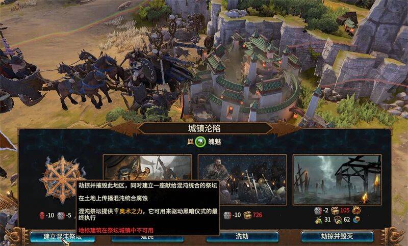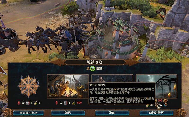 玩家在攻破城市后,可以选择劫掠并毁灭。选择该选项后除了会立刻获得少量战利品外,还会生成一支携带战利品的军队。玩家需要让这支劫掠队回到己方城镇,才能获得这笔战利品奖励。