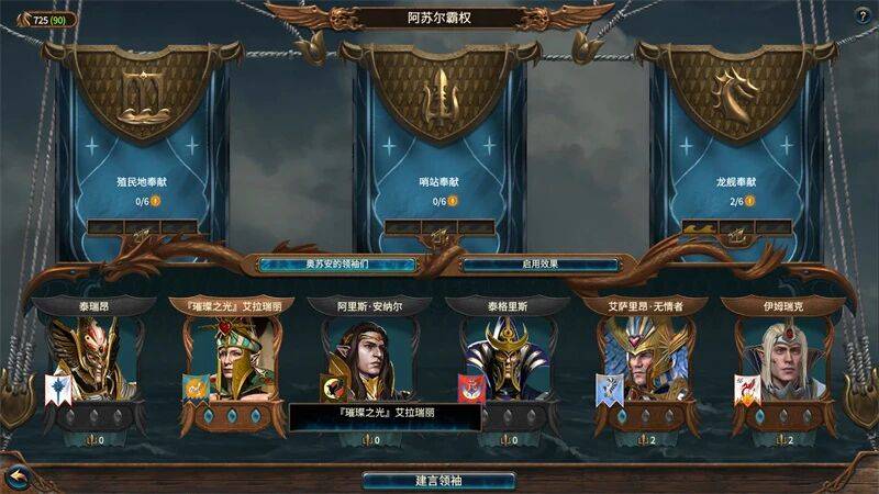 艾斯林的另一项独有机制被称为“阿苏尔霸权”。通过在精灵哨站建造特定建筑产生“奉献”,玩家可以对“哨站”“殖民地”“龙舰”进行强化,并解锁更多的殖民地和龙舰可用数量。每隔一定回合,玩家还可以对其他高等精灵传奇领主使用“建言”,根据赠送给他们的城市数量获得一些特定增益。