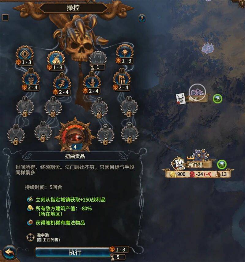 萨尔的另一机制是“操控”,玩家可以通过这一特殊界面,执行各种战略操作,诸如禁用某一派系的招募功能,立即在某座城市的城墙上打开缺口等。随着受关注等级提升,玩家能执行的战略操作也会提升,最多可达16种。