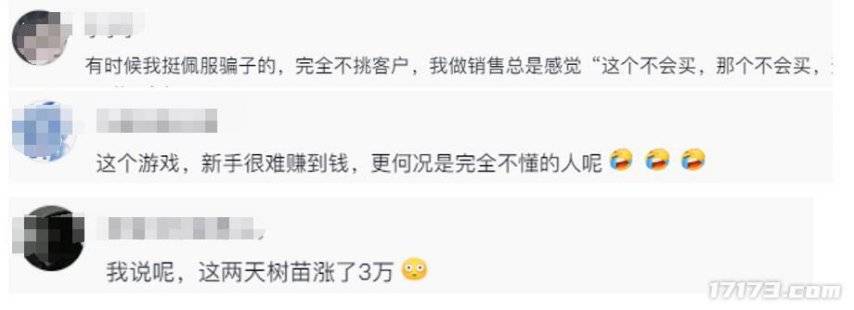 对此有曾经做销售的网友感慨,有时候挺佩服骗子的,完全不挑客户。也有熟悉游戏的网友直言,这游戏新手很难赚钱,更何况是完全不懂的人。还有梦幻玩家调侃,我说这两天游戏里的树苗怎么涨了3万。