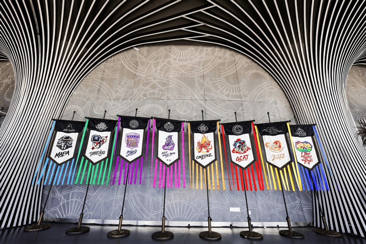 除了激烈的选手对决,本届赛事另一大看点那必须是苏绣战旗!官方特邀苏绣大师张雪为8支战队量身打造的专属战旗,就陈列在赛场显眼位置,“平、齐、细、密”的非遗技法搭配战队专属Logo,引得不少玩家专程过来拍照打卡,毕竟这可是非遗艺术品!