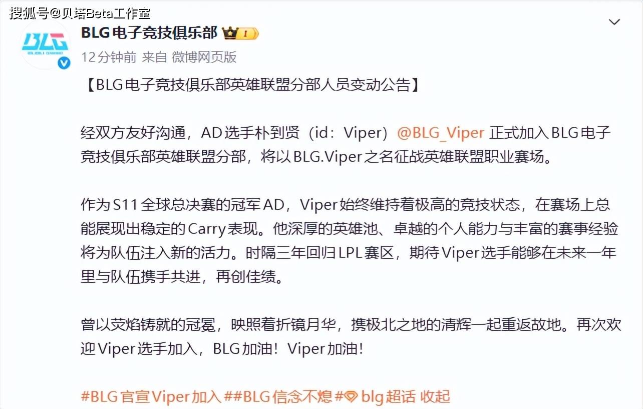 接着马不停蹄,BLG官宣了今年转会期最大的消息,Viper回归LPL加入BLG。BLG的官宣原文如下,表示Viper正式加入,一起征战LPL,随后BLG官博回顾了Viper的荣誉,也认可了他的竞技状态以及赛场上的表现,最后则是表示时隔3年回归LPL,期待Viper可以在未来一年里再创佳绩。
