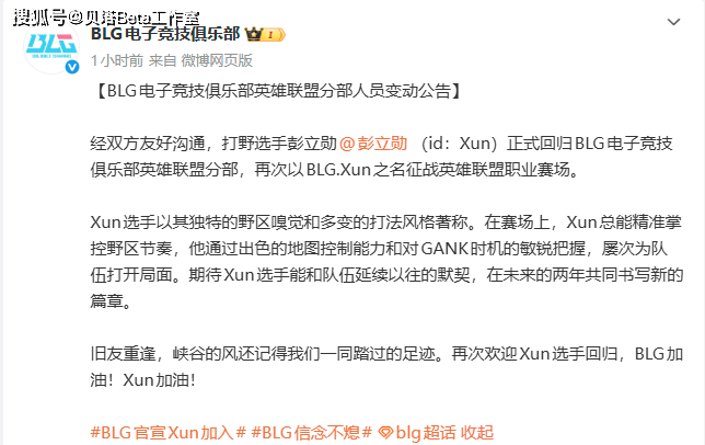 首先是xun回归的官宣,BLG原文如下,宣布xun正式回归BLG,再次一起征战LPL的职业赛场,接着BLG称赞了xun的打法风格,以及对野区的掌握,认可他之前为队伍的付出和贡献,最后就是希望可以延续默契,在未来的2年一起书写新的篇章。