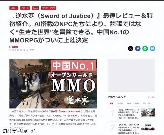 截至目前仍旧在欧美主流市场的角色扮演类游戏榜单中稳居前列,日本《朝日新闻》等多家海外媒体盛赞《逆水寒》手游为“中国第一MMO游戏”。