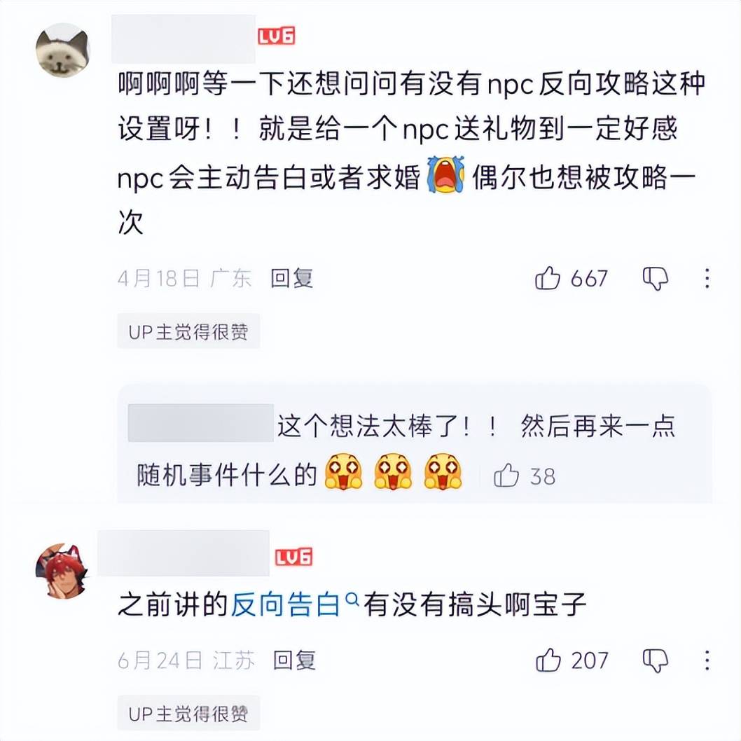 比较特别之处在于,玩家和NPC之间是双向互动的——除了玩家主动找NPC对话外,等感情线推进到一定程度后,NPC可能会主动邀约玩家约会,或是在玩家遇到困难时提供帮助。这个点子的诞生的背后,他们收集了很多玩家的意见,发现许多人都希望体验一次被“倒追”的情节。而通过一个双向互动,就能够非常有效地提升NPC的“人感”,让游戏的情感陪伴体验变得更为沉浸真实。