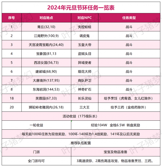 本次环任务相对简单,也不存在变异怪物,所以大家可以放心组队。不过,由于怪物血量较多,所以建议携带高伤召唤兽。另外,本次环任务路途较远,想快速刷满100环的话,需要准备好旗子、飞行符等道具。