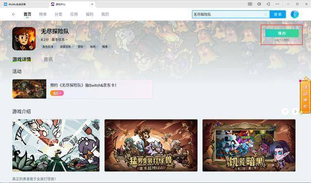 方法一:启动模拟器,在游戏中心搜索“无尽探险队”,点击预约,待游戏上线后即可畅玩。