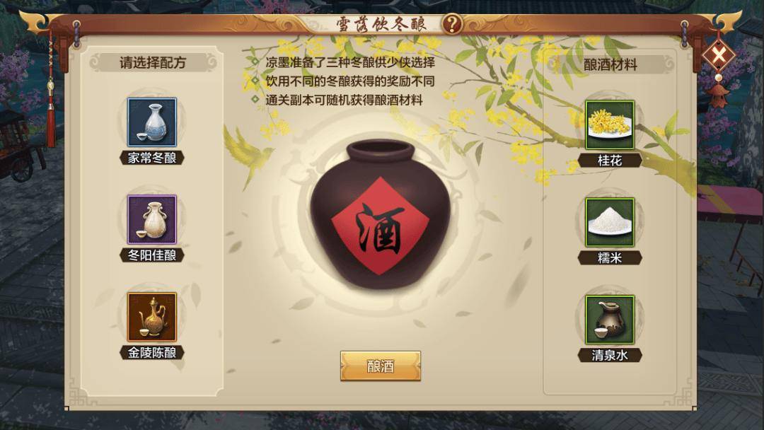 12月5日-12月11日期间,少侠每日完成副本即可收集这三样酿酒材料。待材料集满,交至凉墨手中,便能换得她亲手酿制的冬酿酒。入口温润,暖意透身,更是暖透这一整个江湖冬天。