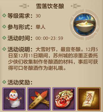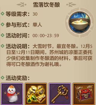 大雪时节,最宜冬酿。苏州城内岁暮天寒,檐角覆雪,炉火初红,正是围炉温酒、喜迎深冬之际。凉墨已备好酒坛,正托少侠们帮忙收集酿制冬酒的材料,桂花、糯米、清泉水。