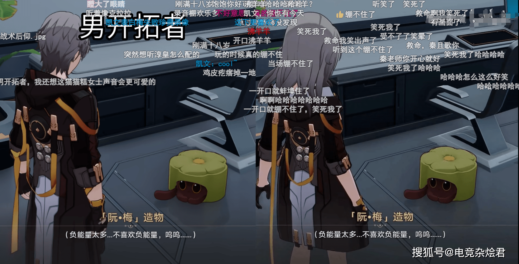 在最新的1.6的剧情里,咱们开拓者在和“阮·梅”的造物“猫猫糕”接触时,会猝不及防的被制作组整蛊。由于负责翻译的“联觉信标”只会是主角自己的声音,因此当开拓者和猫猫糕接触时,就会听到主角用特别委屈的声音说话。女开拓者还好,是很可爱的撒娇声,但男开拓者就很难绷了,因为主角用的那种娇滴滴的猛男撒娇声线,听完后大家只有一个念头“什么鬼动静”?